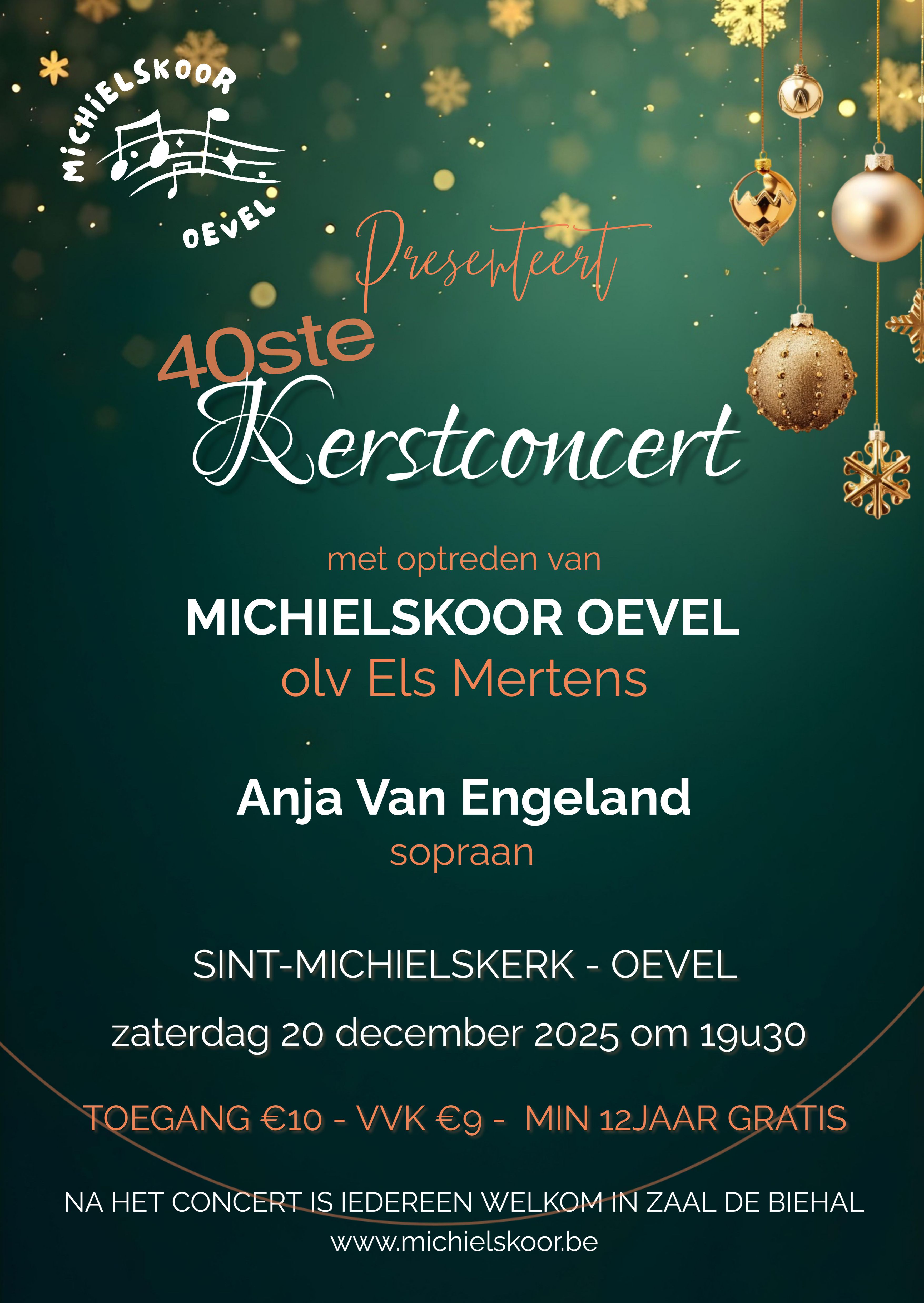Wij nodigen u vriendelijk uit op dit concert dat doorgaat op zaterdag 20 december 2025 om 19u30 in de parochiekerk van Oevel, Sint-Michielsplein, 2260 Oevel-Westerlo.